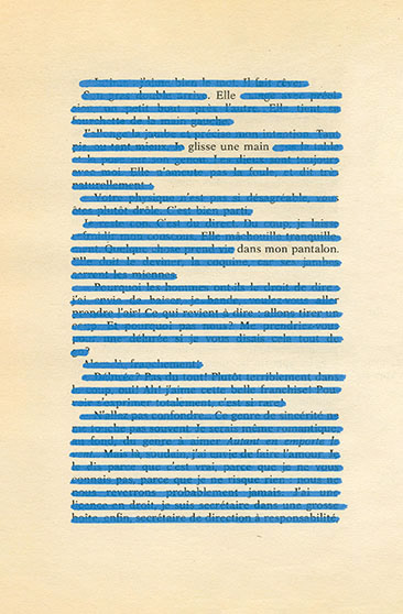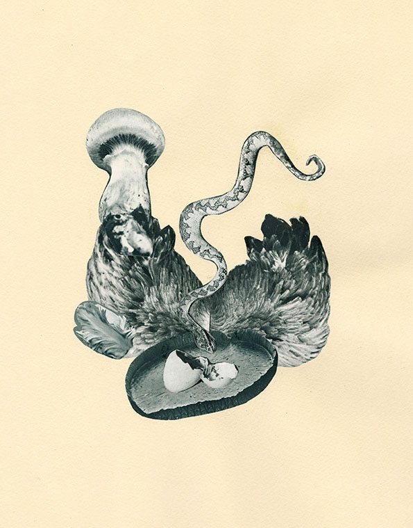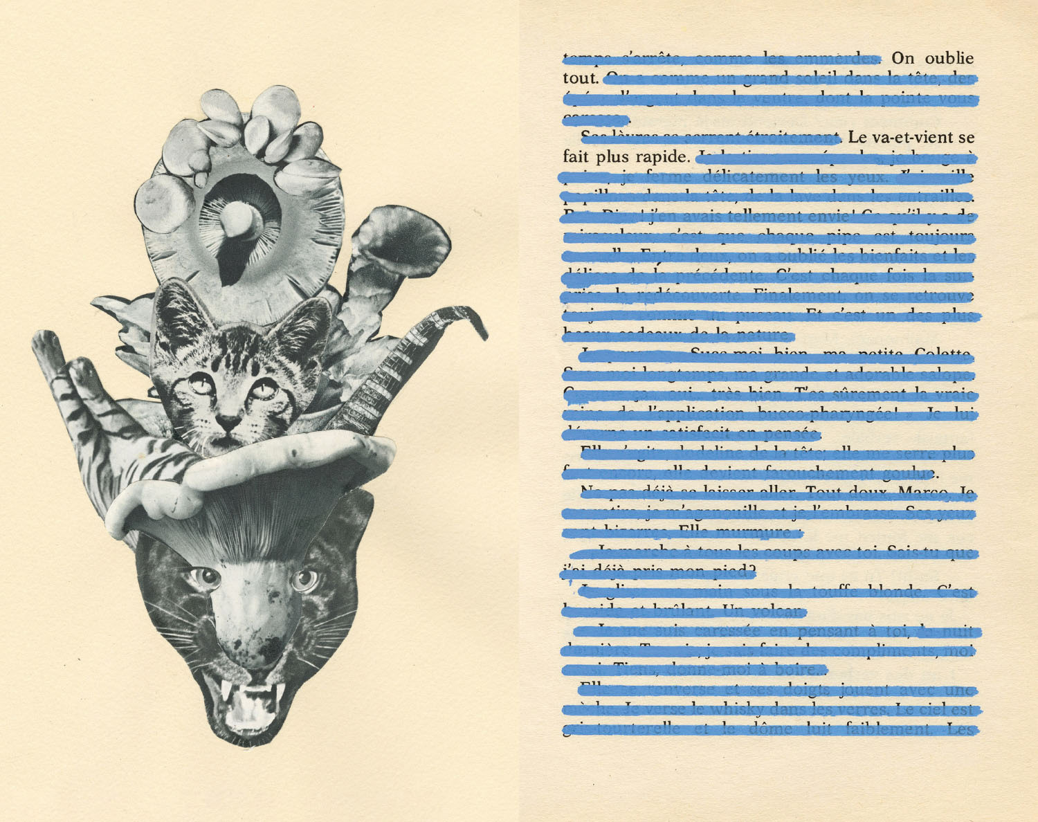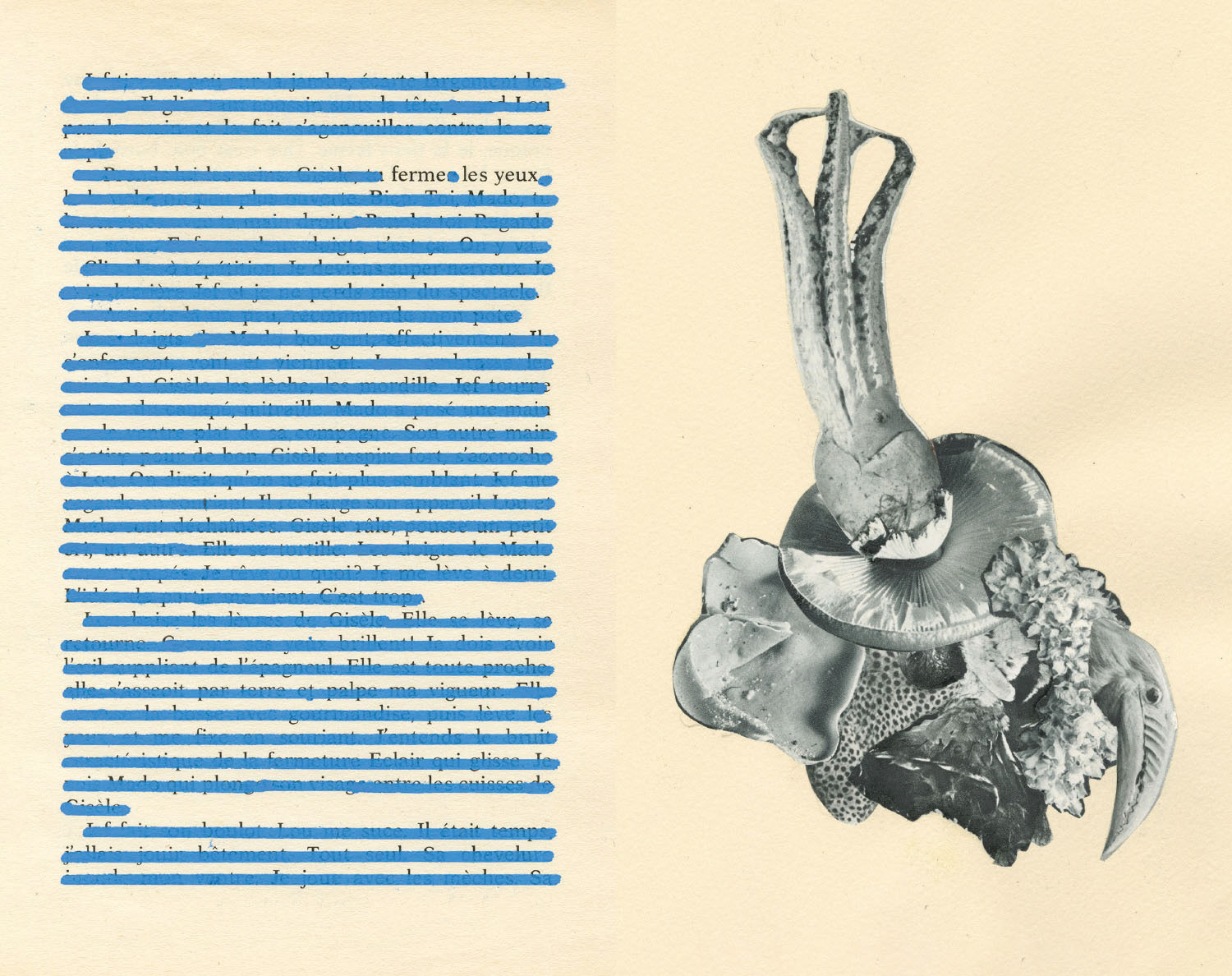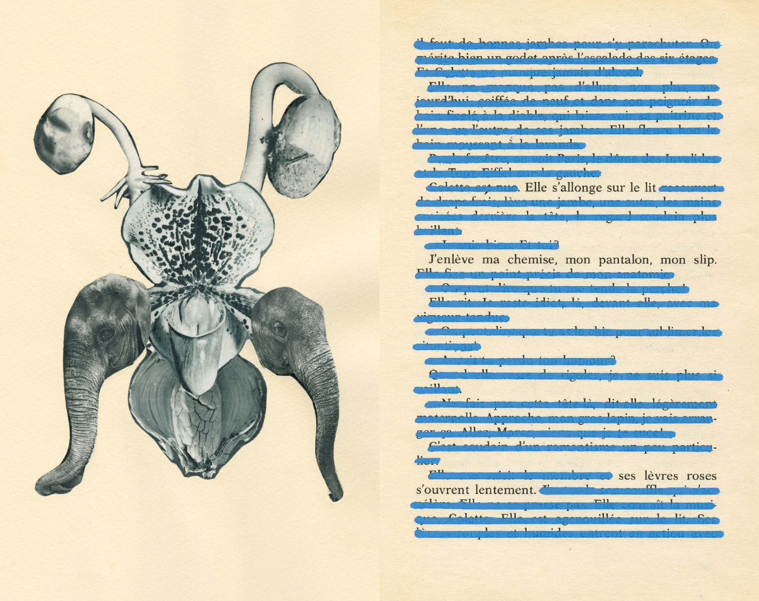 Notre projet actuel prend la forme d’œuvres et d’une performance dans une esthétique bleu-vert érotico-végétale. À travers le détournement d’anciennes encyclopédies naturalistes (photomontages) et l’imaginaire du roman de gare, nous faisons dialoguer sexualité et désir humains et vitalité procréative de la nature. Les œuvres mêlant caviardage et collage jouent sur les contrastes entre sensualité, savoir scientifique et fiction populaire.